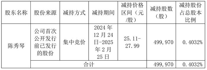 2024年12月24日-2025年2月25日,陈秀琴减持了49.997万股熊猫乳品,减持价格区间在25.11元-27.99元,套现金额1255.42万元-1399.42万元。