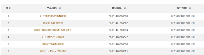 据中国理财网数据,截至目前,光大理财旗下共有6只权益类产品,分别为阳光红优选500指数增强、阳光红新能源主题、阳光红基础设施公募REITs优选1号、阳光红ESG行业精选、阳光红300红利增强、阳光红卫生安全主题精选。