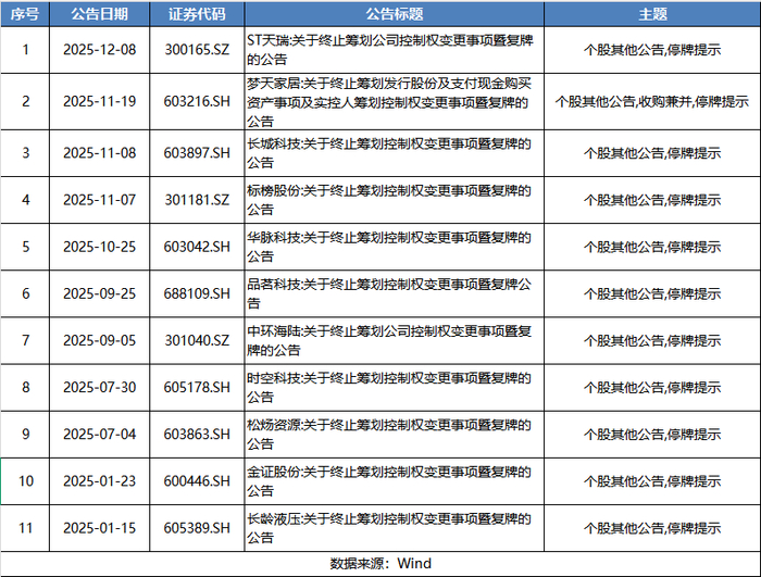 12月7日,ST天瑞(300165.SZ)披露公告,因控股股东、实际控制人刘召贵与交易对方未就控制权变更核心事项达成一致,决定终止相关筹划,公司股票自12月8日开市起复牌。