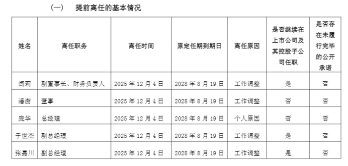 近日,大商股份发布公告称,该公司副董事长兼财务负责人闫莉、董事潘澍、总经理庞华以及副总经理于世杰、张嘉川共计五位董事及高管均于2025年12月4日提前离任。