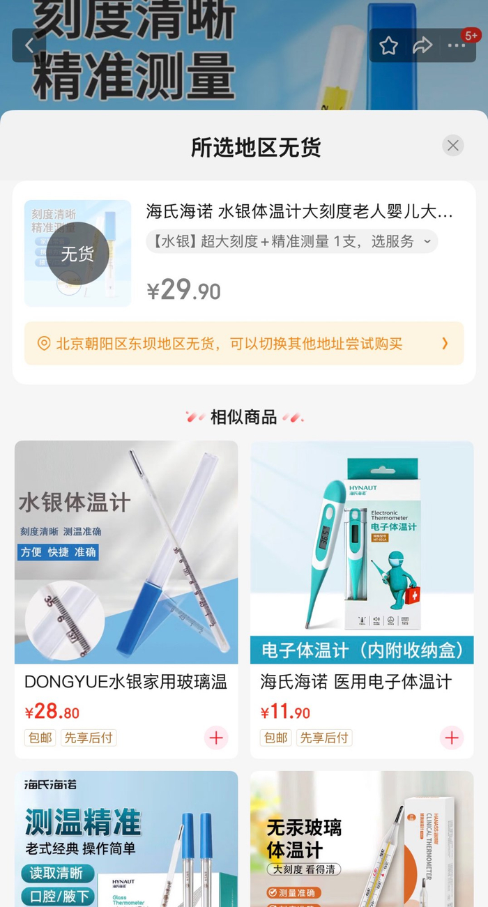 图片来源:京东APP在淘宝平台,时代周报记者发现,阿里健康大药房和天猫超市中有多款水银体温计产品显示商品已卖光,也有多款产品进入界面后发现只有电子体温计可以购买,还有货的部分商家售价多在每支15元以上。