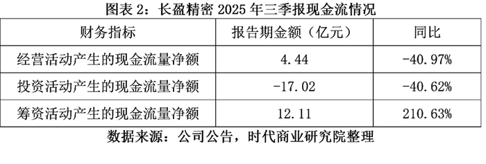再看现金流量表,2025年前三季度,该公司经营活动产生的现金流量净额、投资活动产生的现金流量净额分别为4.44亿元、-17.02亿元,同比分别下滑40.97%、40.62%;而筹资活动产生的现金流量净额为12.11亿元,同比激增210.63%。
