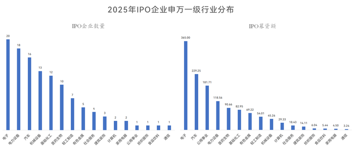 根据申万一级行业分类标准,电子行业在IPO企业数量和募资额上均位居榜首,分别为20家、365.00亿元,分别占全年IPO数量和募资总额的17.24%、27.70%。