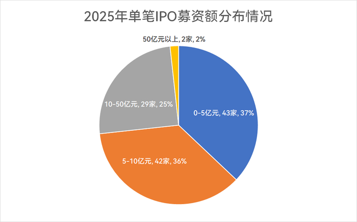 综合来看,2025年前十大IPO合计募资额563.21亿元,占全年募资额的42.74%,已接近5成。同时,募资额在10亿以下的IPO数量有85家,小额募资仍是大多数情况。