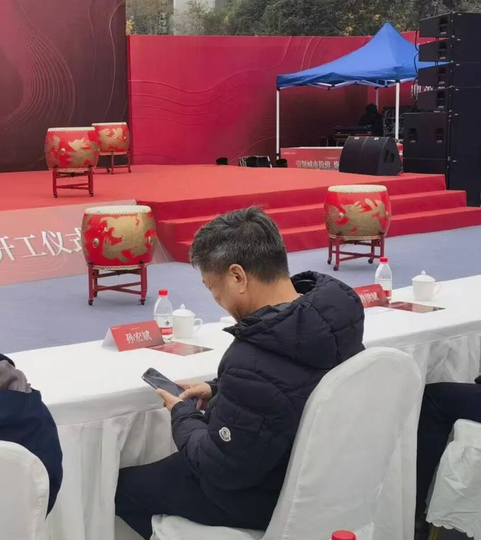 从现场图片来看,穿着奢侈Moncler羽绒服的孙宏斌心情挺好,和很多领导在谈话交流。