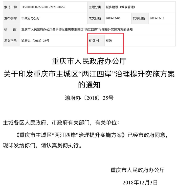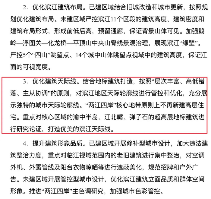 2018年12月17日,重庆市人民政府办公厅公布了《重庆市主城区“两江四岸”治理提升实施方案》,在方案里面要求,“两江四岸”核心地带原则上不再新建高层住宅。重点对核心区域的渝中半岛、江北嘴、弹子石的超高层地标建筑进行研究论证,打造优美的滨江天际线。
