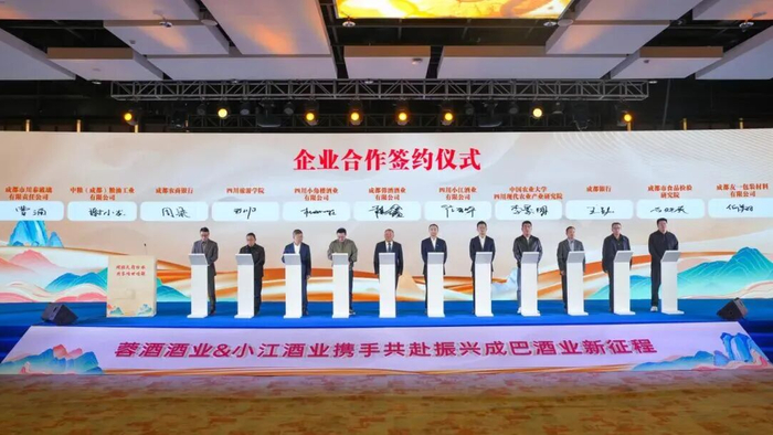 资产整合方面,活动现场,成都蓉酒、小江酒业联合四川小角楼酒业,共同与中国农业大学四川现代农业产业研究院、四川旅游学院、成都银行、成都农商行等签订合作协议,合作范围覆盖科研技术、金融服务、检验检测、供应链等多个领域。