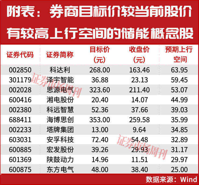 此外,3月份以来,已有多只储能股得到了券商的买进评级,且给出的目标价较当前股价有较高的上行空间(见附表)。
