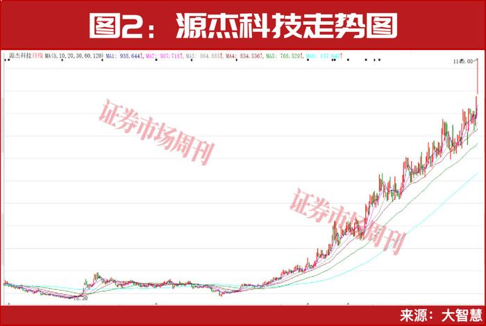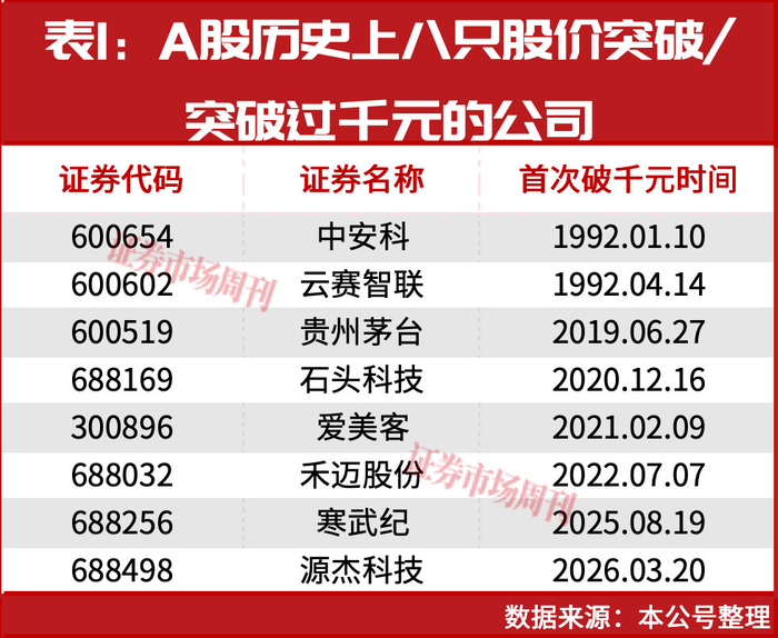 身为行业内的绝对龙头,源杰科技表现尤为强势,早盘开盘后快速拉升,盘中实现“20CM”涨停,股价成功突破千元关口,最高触及1140元/股(见图2),不仅一举超过寒武纪,成为当前A股市场第二高价股,也成为了A股历史上第八只千元股(见表1)。