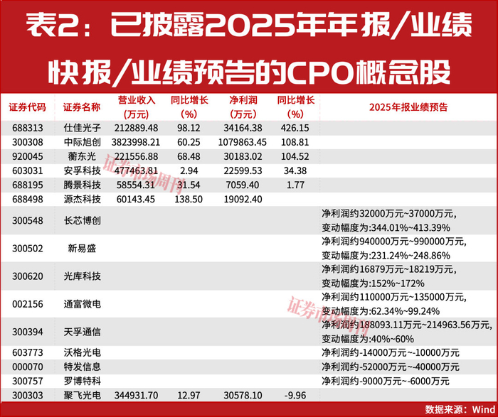 业绩兑现与产业落地也为板块上涨提供了坚实支撑。2025年以来,CPO板块多家上市公司业绩呈现爆发式增长(见表2)。如源杰科技实现扭亏为盈;中际旭创归母净利润达107.99亿元,同比增长108.81%,订单排满至2026年底;仕佳光子归母净利润同比增幅超400%,行业已从概念炒作全面转向业绩兑现阶段。