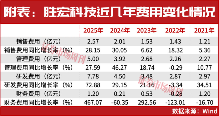 事实上,胜宏科技在2025年就已加大研发力度。2025年年报显示,公司2025年研发费用达7.78亿元,同比增长72.88%,这一增速创公司近五年新高(见附表)。同时,公司研发费用规模的增长远远跑赢销售费用、管理费用等。另外,在其2025年研发费用中,直接投入费用达4.58亿元,同比翻倍增长。