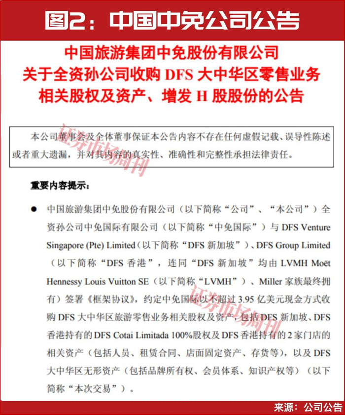 公告还提到,中国中免全资孙公司中免国际以不超过3.95亿美元现金方式收购DFS大中华区旅游零售业务相关股权及资产,包括DFSCotaiLimitada100%股权及DFS香港持有的2家门店的相关资产,以及DFS大中华区无形资产。