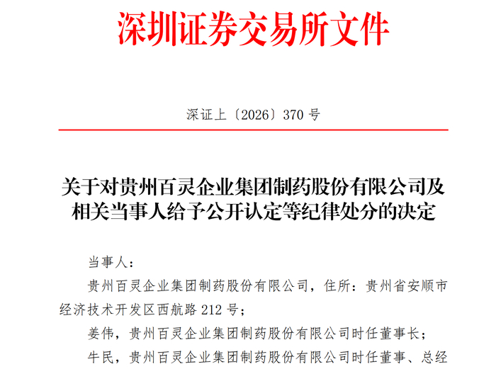 (深交所对贵州百灵纪律处分的决定。 公告/截图)3月27日,全国苗药龙头上市公司贵州百灵(002424.SZ)方面披露,公司及相关当事人分别收到贵州证监局下发的《行政处罚决定书》。