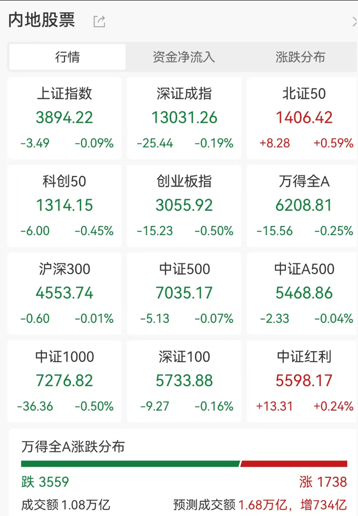 个股跌多涨少,沪深京三市超3500股飘绿,超1700股上涨。上午半天成交1.08万亿。午间收盘沪指跌0.09%,深成指跌0.19%,创业板跌0.5%。