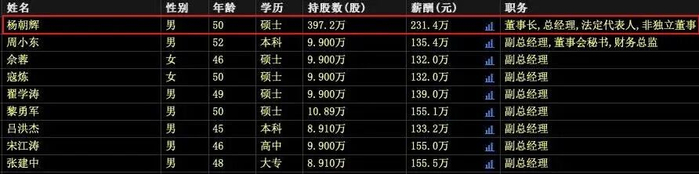 九位高管的平均薪酬在150万元左右,其中,杨朝辉待遇最佳,达到231.4万元。