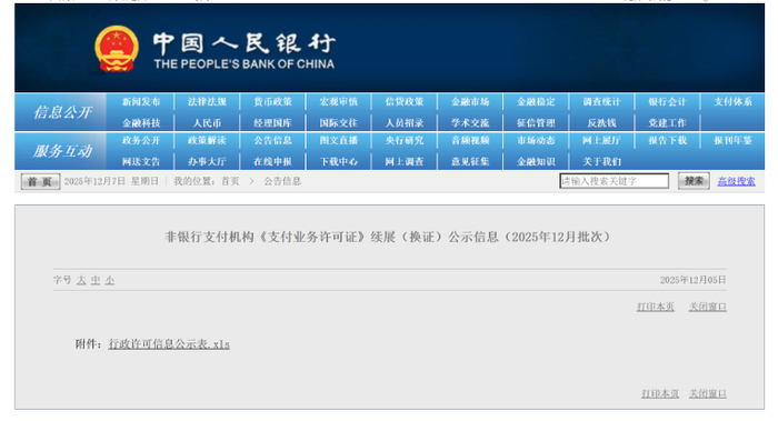 近日,央行官网发布非银行支付机构《支付业务许可证》续展(换证)公示信息(2025年12月批次)。信息显示,传化支付有限公司(以下简称“传化支付”)正式换发长期有效的支付牌照,许可内容为“储值账户运营Ⅰ类、储值账户运营Ⅱ类(仅限线上实名支付账户充值)”。