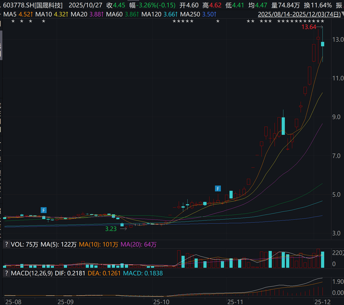 如果将时间放宽至9月底,国晟科技的股价则从盘中最低的3.23元上涨至12月3日盘中最高的13.64元,累计涨幅超过300%。