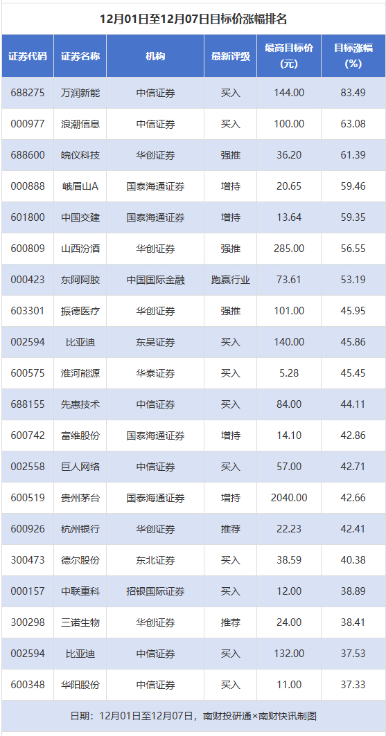 南财投研通数据显示,12月1日至12月7日,券商给予上市公司目标价共79次,按最新收盘价计算,目标价涨幅排名居前的公司有万润新能、浪潮信息、皖仪科技,目标价涨幅分别为83.49%、63.08%、61.39%,分别属于电池、计算机设备、通用设备行业。