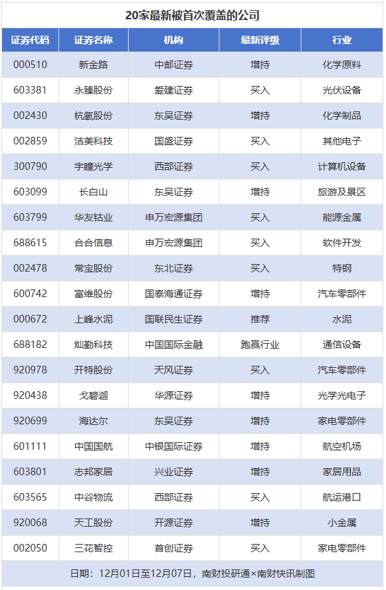 首次覆盖方面,12月1日至12月7日券商共给出了53次首次覆盖,其中新金路获得中邮证券给予“增持”评级,永臻股份获得爱建证券给予“买入”评级,杭氧股份获得东吴证券给予“增持”评级,洁美科技获得国盛证券给予“买入”评级,宇瞳光学获得西部证券给予“买入”评级。