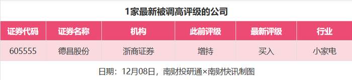 评级调高方面,12月8日,券商调高上市公司评级达到1家次,浙商证券对德昌股份的评级从“增持”调高至“买入”。