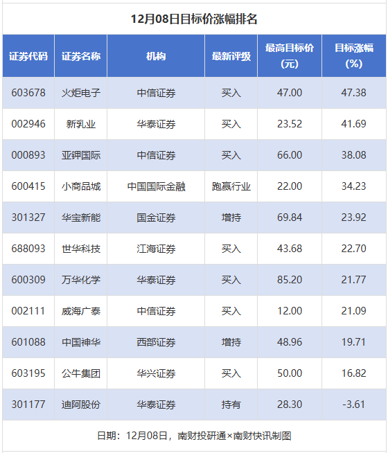 南财投研通数据显示,12月8日,券商给予上市公司目标价共11次,按最新收盘价计算,目标价涨幅排名居前的公司有火炬电子、新乳业、亚钾国际,目标价涨幅分别为47.38%、41.69%、38.08%,分别属于军工电子、饮料乳品、农化制品行业。