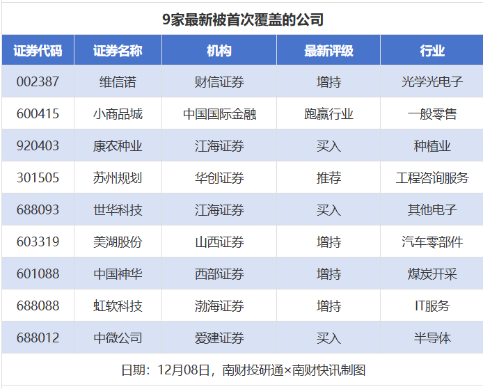 首次覆盖方面,12月8日券商共给出了9次首次覆盖,其中维信诺获得财信证券给予“增持”评级,小商品城获得中国国际金融给予“跑赢行业”评级,康农种业、世华科技获得江海证券予“买入”评级,苏州规划获得华创证券给予“推荐”评级。