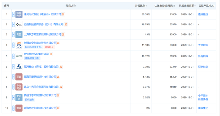 光和谦成股东信息 图片来源:天眼查21世纪经济报道记者发现,光和谦成的股东共计10位,分别为:通威光伏科技(峨眉山)有限公司、协鑫科技咨询服务(苏州)有限公司、上海东方希望新能源科技有限公司、新疆大全新能源股份有限公司、新特能源股份有限公司、亚洲硅业(青海)股份有限公司、青海丽豪新能源科技有限公司、北京中光同合能源科技有限公司、新疆戈恩斯能源科技有限公司、青海南玻新能源科技有限公司。