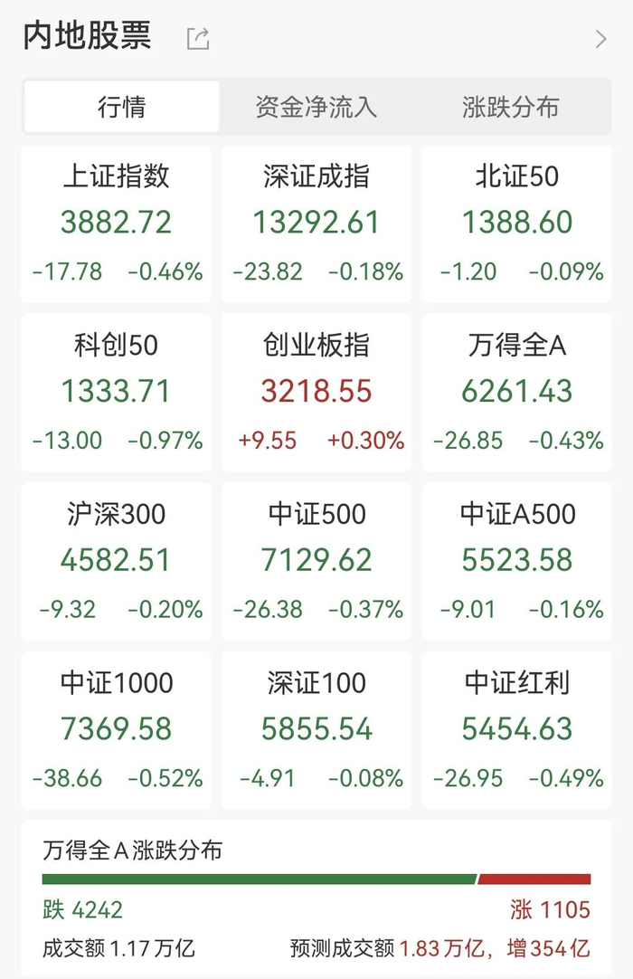 12月11日,A股早盘三大指数涨跌不一,沪指震荡下跌,创业板指冲高回落,此前一度涨超1%。截至午盘,沪指跌0.46%失守3900点,深成指跌0.18%,创业板指涨0.3%。沪深两市半日成交额1.17万亿,全市场超4200只个股下跌。