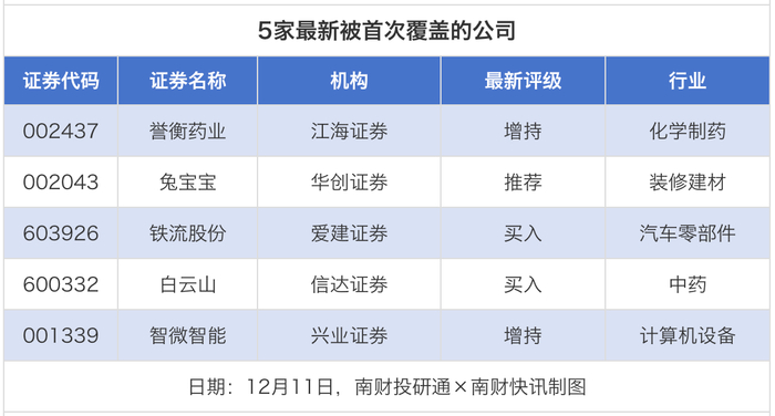 首次覆盖方面,12月11日券商共给出了5次首次覆盖,其中誉衡药业获得江海证券给予“增持”评级,兔宝宝获得华创证券给予“推荐”评级,铁流股份获得爱建证券给予“买入”评级,白云山获得信达证券给予“买入”评级,智微智能获得兴业证券给予“增持”评级。