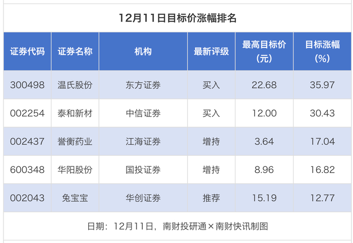 南财投研通数据显示,12月11日,券商给予上市公司目标价共5次,按最新收盘价计算,目标价涨幅排名居前的公司有温氏股份、泰和新材、誉衡药业,目标价涨幅分别为35.97%、30.43%、17.04%,分别属于养殖业、化学纤维、化学制药行业。