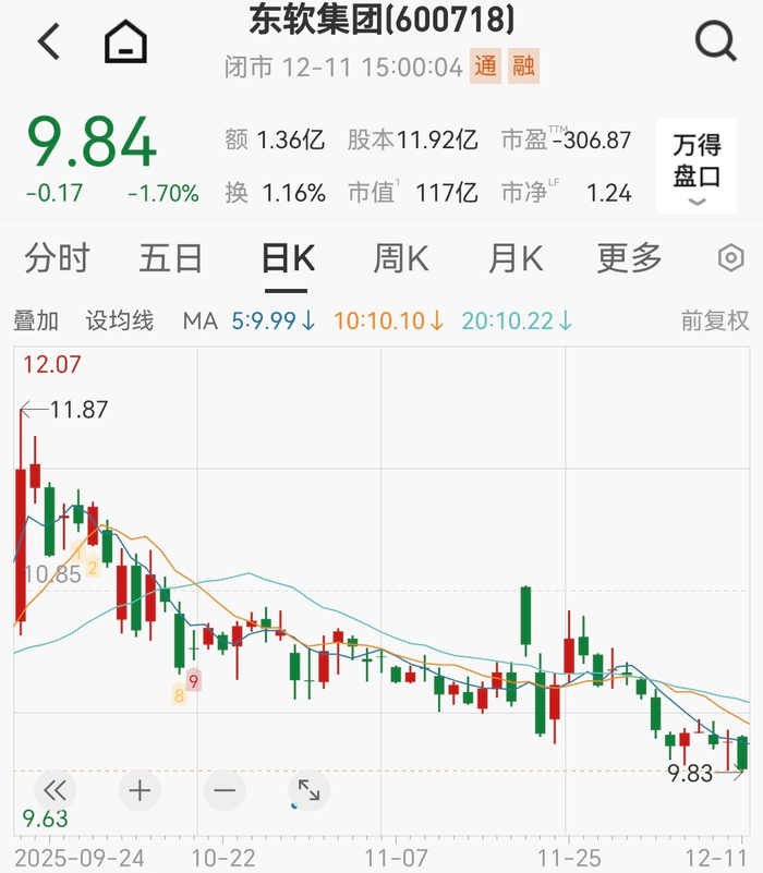 截至12月11日收盘,东软集团股价为9.84元/股,总市值为117亿元。