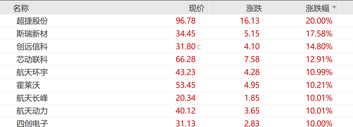 商业航天概念全线爆发,超捷股份20cm涨停,华菱线缆、中超控股两连板,东方通信、长城电工等十余股涨停,超捷股份、创远信科等多只个股涨超10%。