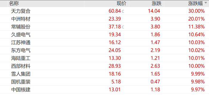 A股可控核聚变概念午后持续走强,斯瑞新材、爱科赛博盘中创新高,天力复合、雪人集团2连板,四创电子、中国核建、保变电气、中洲特材、顺钠股份、江苏神通、安泰科技、国机重装、中国西电涨停,常辅股份涨超15%,哈焊华通、久盛电气涨超10%,中泰股份、东方电气、广大特材、西部超导、辰光医疗跟涨。
