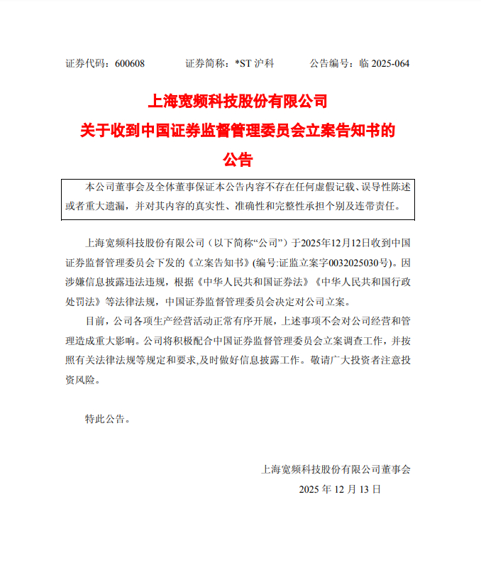 突发!12月12日晚间,上海宽频科技股份有限公司(*ST沪科,600608)公告称,公司于2025年12月12日收到中国证券监督管理委员会下发的《立案告知书》。因涉嫌信息披露违法违规,根据《中华人民共和国证券法》《中华人民共和国行政处罚法》等法律法规,中国证券监督管理委员会决定对公司立案。