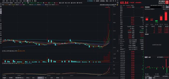 在核聚变和商业航天等热门概念的催化下,天力复合的股价过去一周连收五个阳线,累计涨幅超117%,其中12月11日-12日连续两日30CM涨停。