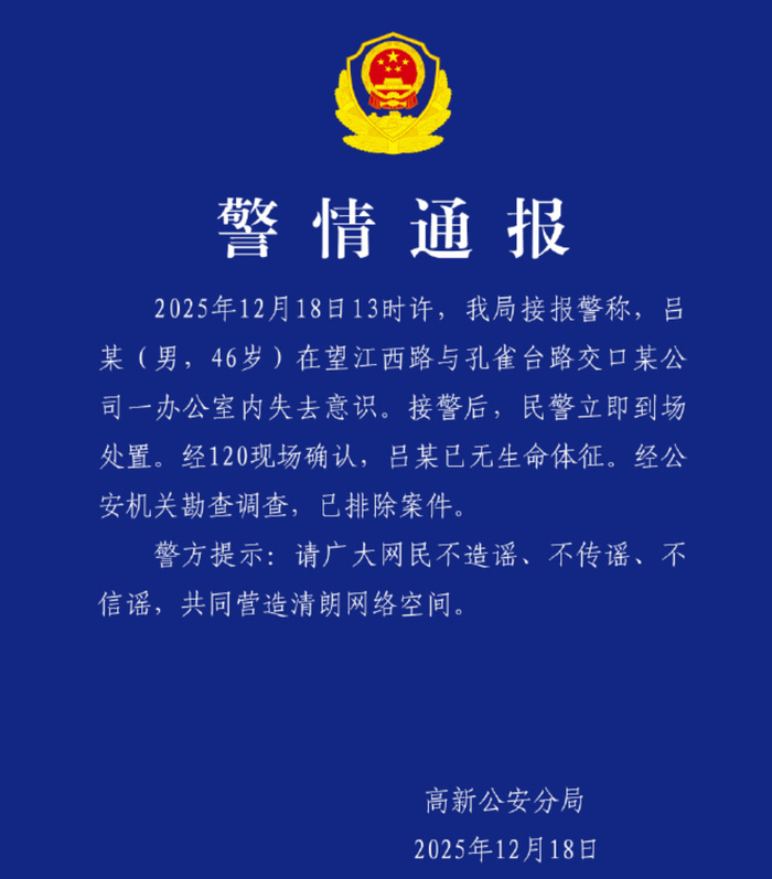 合肥市公安局高新技术开发区分局18日在该公司公告前已发布警情通报称,经公安机关勘查调查,“已排除案件”。