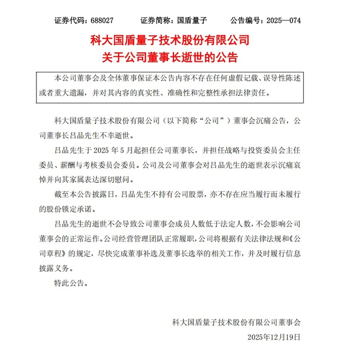 12月18日晚间,国盾量子(688027)公告,公司董事长吕品不幸逝世。
