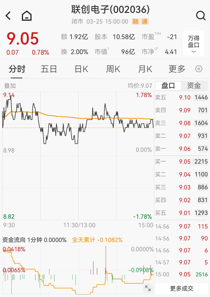 截至3月25日收盘,联创电子报9.05元/股,涨0.78%。