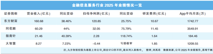 受益于市场交投活跃,金融信息服务行业迎来业绩大年。随着同花顺、东方财富、指南针、大智慧、九方智投控股等5家公司年报的陆续出炉,一幅“景气上行但分化加剧”的图景浮现:有的公司赚得盆满钵满,有的则仍在探索新出路。而在这5家公司的年报里,“AI”都是一个绕不开的关键词:它不再是锦上添花的点缀,而是正在重塑行业格局的变量。