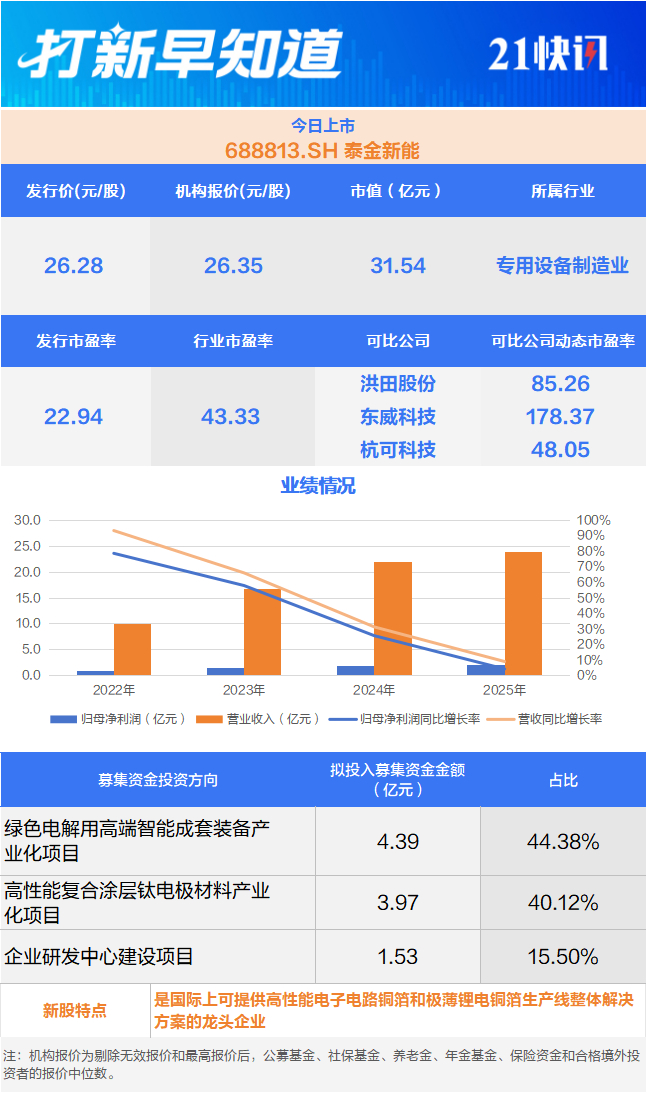 客户方面,泰金新能客户主要分布于电解铜箔、绿色环保、铝箔化成、湿法冶金、航天军工等行业。公司高端电解成套装备的主要境内客户包括比亚迪、嘉元科技、中一科技、海亮股份、铜冠铜箔、江铜铜箔、江西铜博、德福科技、甘肃德福、百嘉达、湖北中科、建滔铜箔、深耕铜箔、金都电子、新疆亿日、圣达电气、金宝电子、湖南龙智等;公司钛电极及玻璃封接制品的主要境内客户包括青岛双瑞、金川集团、华友钴业、青山集团、中原长江、中电科、航天科技等。