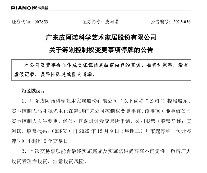 新快报讯 12月8日晚间,皮阿诺发布公告称,公司控股股东、实际控制人马礼斌正在筹划有关公司控制权变更事宜,公司股票自12月9日(星期二)开市起停牌,预计停牌时间不超过2个交易日。若此次控制权转让顺利完成,皮阿诺将成为九大定制家居上市企业中第一家实现控制权变更的公司。