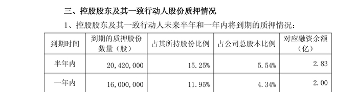 更值得关注的是股权质押层面的潜在风险。根据2026年1月公告,公司控股股东及其一致行动人质押比例较高,合计质押占其持股总数的59.01%,占公司总股本的21.46%。未来半年内,将有2.83亿元质押融资到期,一年内另有2亿元到期。在子公司资金安全事件尚未落地的背景下,控股股东高比例质押所带来的流动性压力,正成为市场关注的又一潜在风险点。