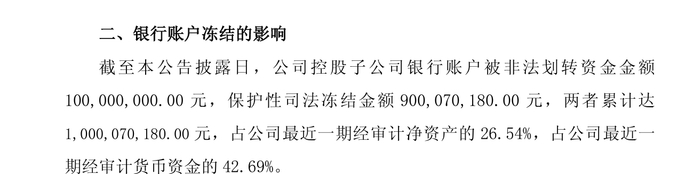 上述公告披露,公司控股子公司银行账户被非法划转资金金额1亿元,保护性司法冻结金额超9亿元,两者累计达10亿元,占公司最近一期经审计净资产的26.54%,占公司最近一期经审计货币资金的42.69%。