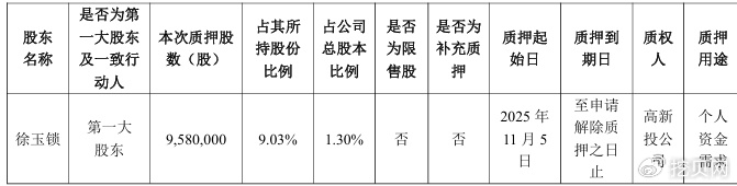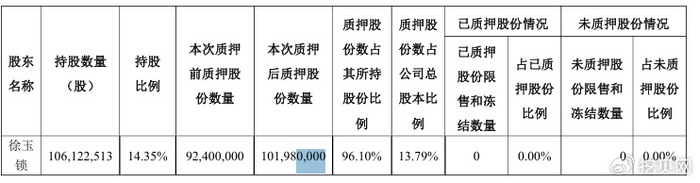 据悉,徐玉锁持有公司股份1.06亿股,累计质押公司股份1.02亿股,占所持公司股份比例96.10%,占总股本13.79%。