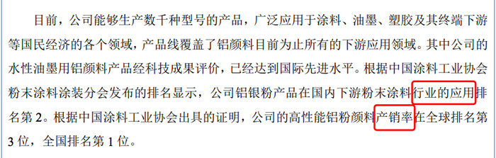 “高性能铝粉颜料产销率全球第3”排名含金量