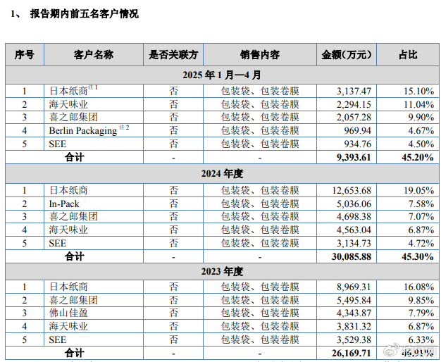 利达新材国际市场开拓比较成功,报告期2023年至2025年前4个月,外销收入占比分别为45.28%、57.61%、50.07%,外销客户主要集中在大洋洲、北美洲、欧洲地区。客户有日本纸商、In-Pack、Berlin Packaging(柏尔林包装)、瑞士雀巢(Nestle)、美国玛氏(Mars)、美国亨氏(Heinz)等。
