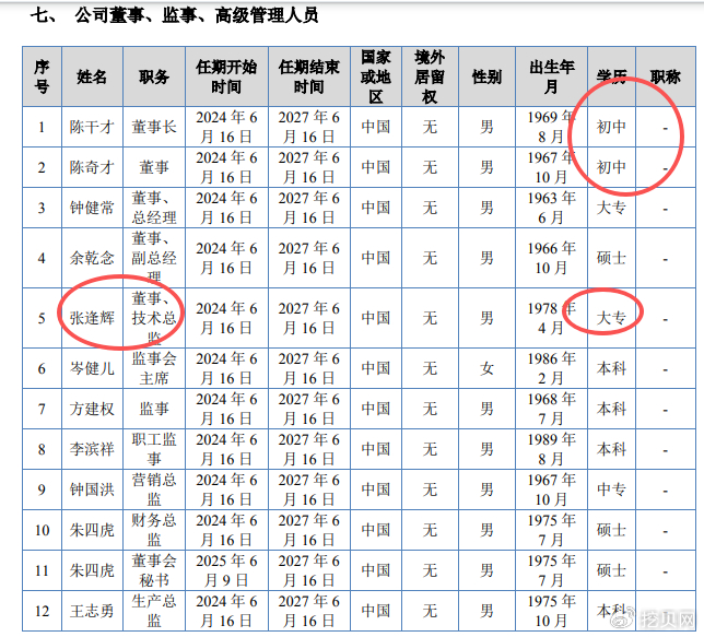 利达新材高管团队朴实无华,学历普遍不高。董事长陈干才为初中毕业,董事陈奇才为初中毕业,总经理钟健常大专毕业。特别是董事、技术总监张逢辉的学历,也只是大专。学历稍微高点的是曾担任生产总监的余乾念,硕士学历,目前担任公司副总经理。另一名硕士毕业的高管是财务总监、董秘朱四虎。