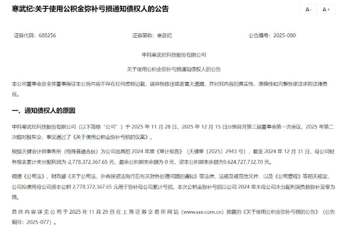 寒武纪在上述公告中披露,根据《公司法》、财政部《关于公司法、外商投资法施行后有关财务处理问题的通知》中“使用资本公积金弥补亏损的公司应自股东会作出资本公积金弥补亏损决议之日起三十日内通知债权人或向社会公告”之规定,公司现通知债权人:公司债权人自接到通知之日起30日内、未接到通知的自本公告披露之日起45日内,均有权凭有效债权证明文件及相关凭证要求公司清偿债务或提供相应担保。债权人未在规定期限内行使上述权利的,不会因此影响其债权的有效性,相关债务(义务)将由公司根据原债权文件的约定继续履行。