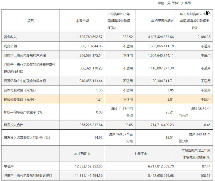 今年前三季度,寒武纪累计营收达46.07亿元,同比增长2386.38%;累计归母净利润约16.05亿元,其中。第三季度单季实现营业收入17.27亿元,同比增长1332.52%,净利润5.67亿元,环比下降16.99%。前三季度,该公司经营活动现金流净额为-2930.48万元。