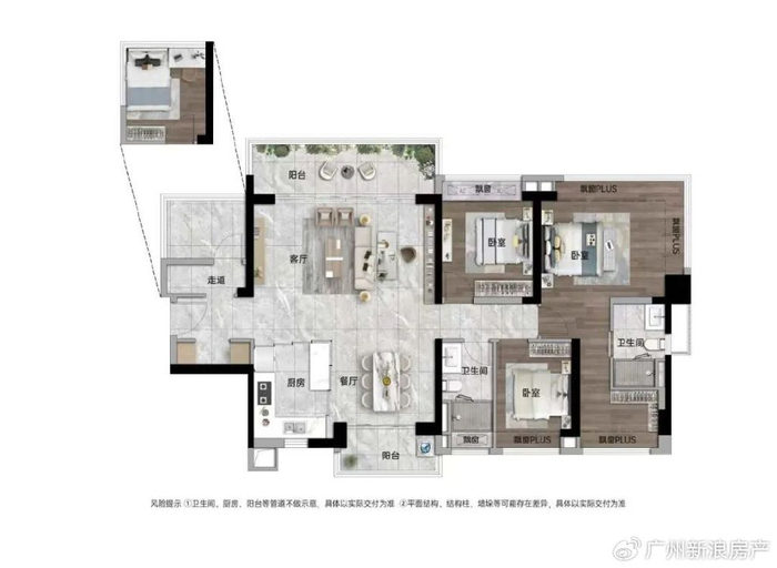 建面约143㎡户型更将实用面积拓展22㎡,形成建面约60㎡的方正超级公区,占全屋面积42%。三面采光主卧套房配备7.2米环幕飘窗与双衣帽间,最小卧室亦可容纳1.5米双人床。
